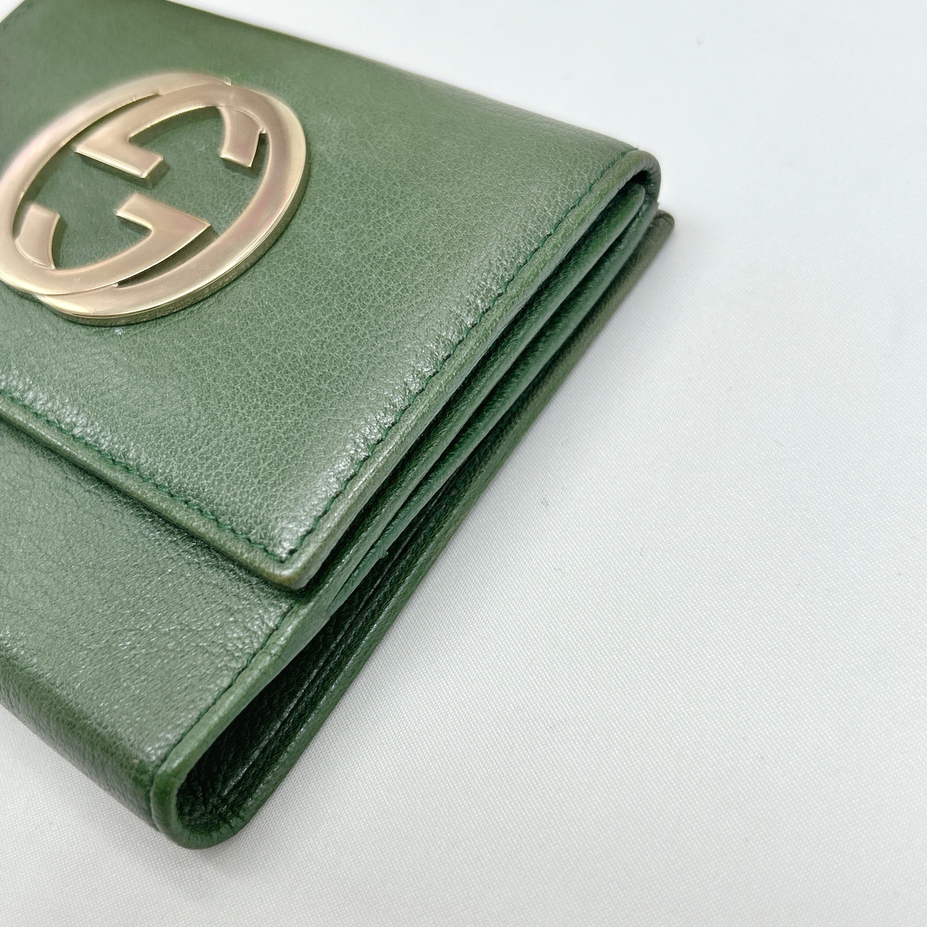 GGロゴが目を引く希少なくすみグリーンカラーの1点物のお財布入荷致しました✨
